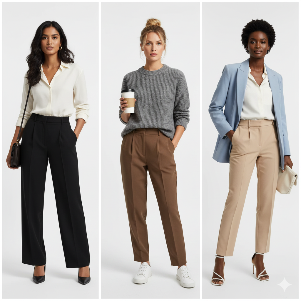Trousers are the sweatpants of your wardrobe. I don’t recommend skinny trousers—go for straight or wide leg. They pair well with sneakers, pumps, and booties. Start with black trousers, then add brown, and finally neutral beige or gray. That way you’re covered for all your top pieces.