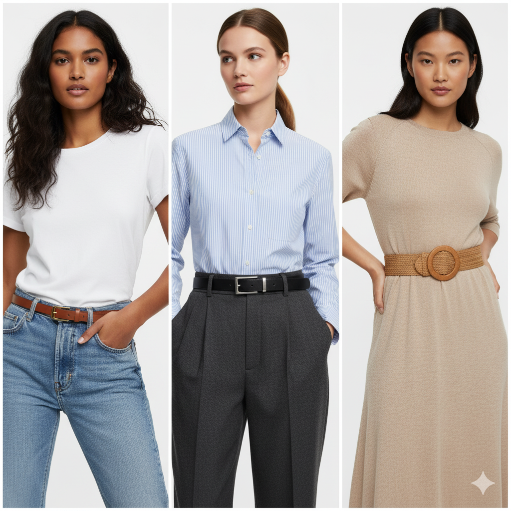 The belt should be nearly invisible. We all love a statement belt, but for your capsule wardrobe, go timeless. I wear one from All Saints frequently. It’s of great quality, flexible, and clean. It elevates your look and ties the outfit together seamlessly.