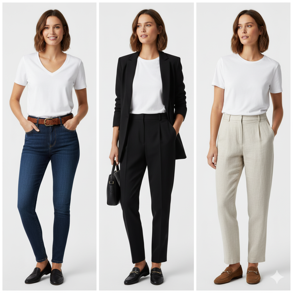 Depending on the type of girl you are or the outfits you’re going for, you might prefer a white T-shirt with a V-cut for a sexier silhouette—maybe paired with dark denim jeans and a cute belt. Then there’s the boxier fit, which is more traditional and gives a boyish look. That’s my preferred fit because it goes with absolutely everything.