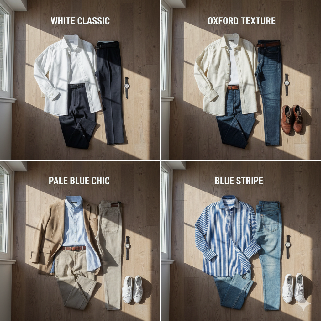 You can’t go wrong with a clean, crisp button-up. I have a plain white one from the men’s section—it’s slim fit and perfect for me. Then there’s my Polo Ralph Lauren Oxford, which has amazing material and feels different. You can wear it more casually. If you’re a little more advanced, get a pale blue button-up, which goes with a lot, and a striped one with blue stripes that pairs well with jeans or trousers.