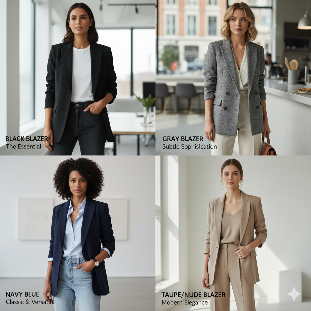 Start with a black blazer, then add gray and navy blue. If this isn’t your first rodeo, get a taupe or nude blazer to elevate your wardrobe.