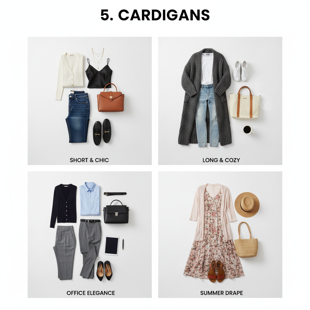 Cardigans are great layering tools for both inside and outside the office. You can choose short or long, thick or light. They’re crucial for fall but also great for warmer seasons when layered over spring or summer dresses.